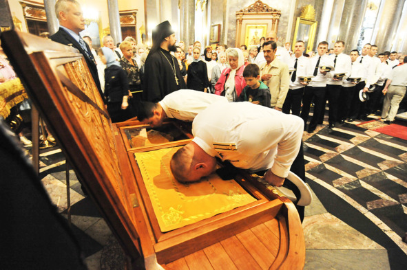 Флотские офицеры прикладываются к мощам адмирала Ушакова. Ну и видуха!