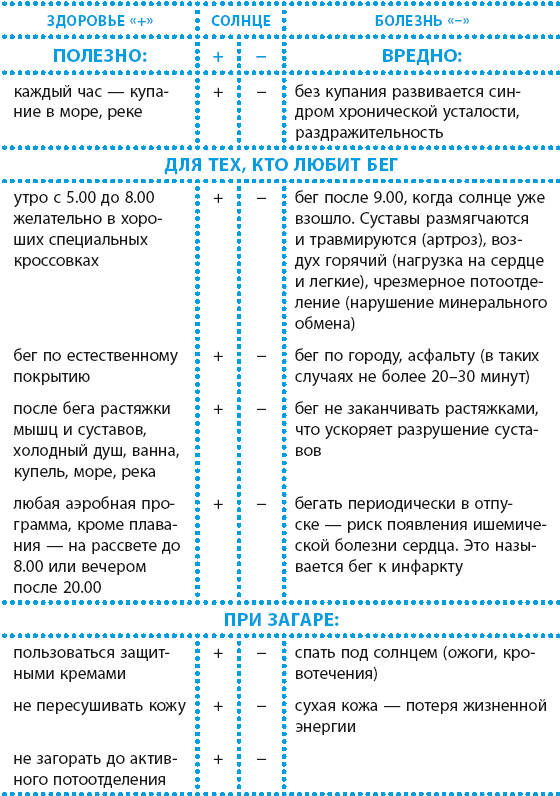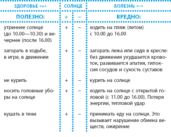 Правила безопасного «общения» с солнцем для активных людей приведены в таблице «+» в левой колонке.