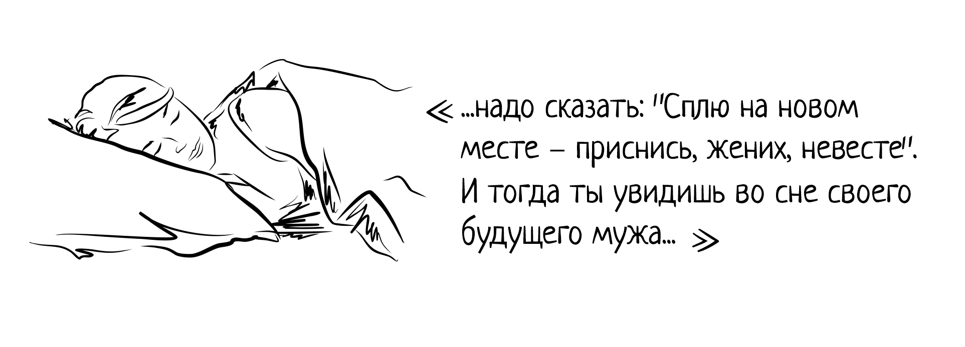 – Да, вот еще что, милая. Если девушка впервые спит на новом месте, то надо сказать: «Сплю на новом месте – приснись, жених, невесте». И тогда ты увидишь во сне своего будущего мужа, – тетя Нюра хитро улыбнулась и вышла.