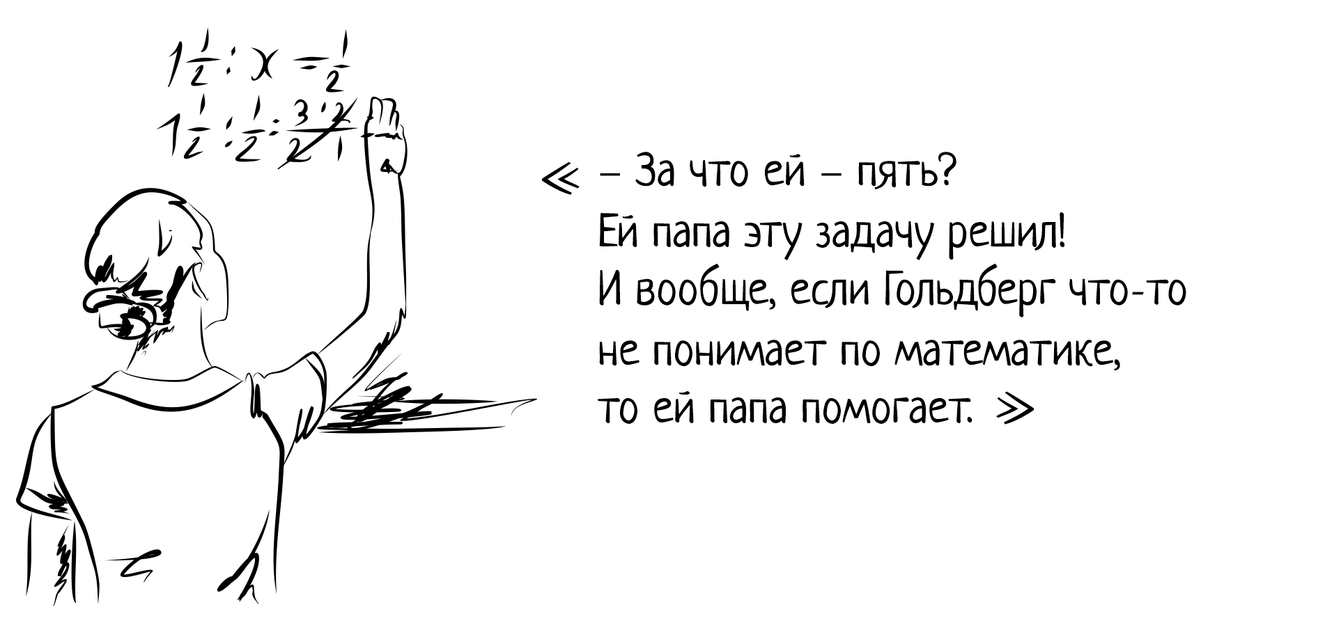 Вдруг раздался резкий возглас: «Это неправильно! За что ей – пять? Ей папа эту задачу решил! И вообще, если Гольдберг что-то не понимает по математике, то ей папа помогает». Клава сидела красная и возмущенная, глаза горели от негодования. «Ну и что? – спокойно сказала Марина Евгеньевна. – Нина не только написала задачу, но и объяснила ее решение. Она ее поняла, а не слепо списала. Она заслужила свою пятерку! Что же касается ее папы, то это просто здорово, что у Нины есть близкий человек, который помогает ей разобраться».