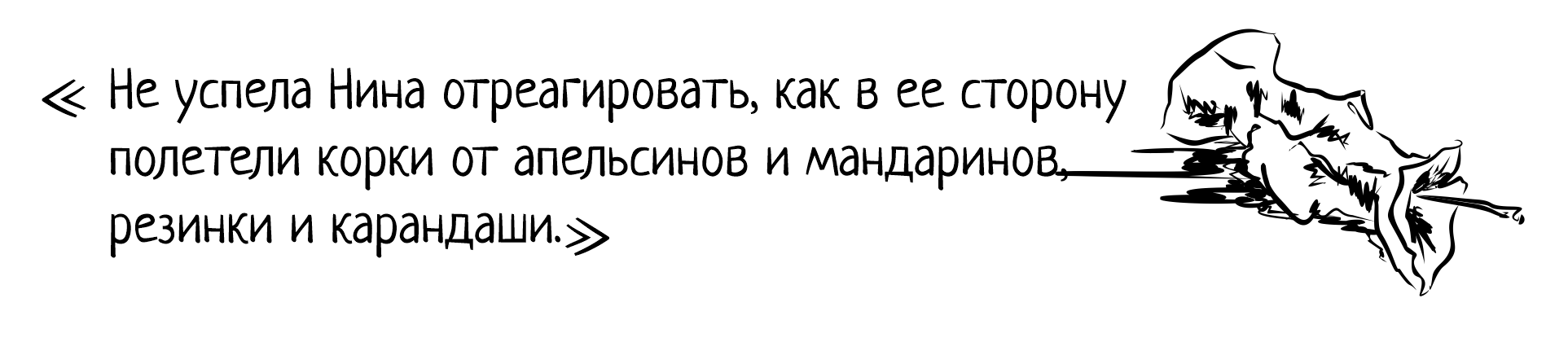 Последующие уроки математики повторялись с методической точностью. Для Елены Львовны войти в класс, в котором ее ждал четвертый «А», было равнозначно тому, чтобы войти в клетку к тиграм. Она каждый раз переступала порог класса, глубоко вздохнув и закрыв глаза. Сначала бывало объяснение новой темы, затем ее закрепление примерами и задачами. Во время объяснения голос Елены Львовны заметно дрожал, движения у доски были неуверенными. Стоя спиной к классу, она ежеминутно оборачивалась, как бы ожидая удара. Во время закрепления темы одна часть класса закрепляла свои знания, вторая же во главе с Клавой Лешиной – закидывала Елену и Нину принесенными с собой шкурками от апельсинов и разным прочим мусором, который в достаточном количестве обнаруживался в любом школьном рюкзаке.
