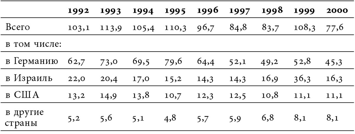 Несколько изменилось в 1990-е годы и основное направление эмиграции. На первое место вышла Германия, не только за счет этнических немцев и членов их семей, но и за счет евреев. Сократилось число выезжающих в США, ибо теперь евреи могут туда выехать только при наличии прямых родственников. В условиях свободного выезда из страны и учитывая массовую национальную (этническую) эмиграцию в 1989–1991 годах, на первое место среди выезжающих из страны на постоянное место жительства вышли русские.