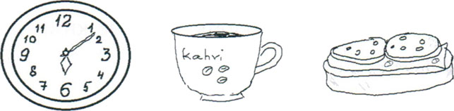 Sitten me syömme lettuja mustaherukkahillolla ja juomme teetä tai kahvia. Minä rakastan kahvia, mutta minun isäni sanoo, että minun pitäisi juoda teetä tai maitoa, koska olen aika pieni nyt. Minun isäni ei syö kanssamme, koska hän käy työssä iltaisin ja nukkuu aamuisin.