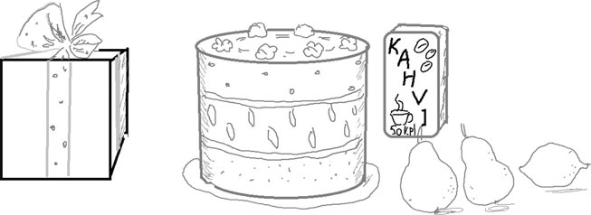 Me ostamme kakkua ja suklaata, kahvia ja hedelmiä kaupasta läheltä kotiani.