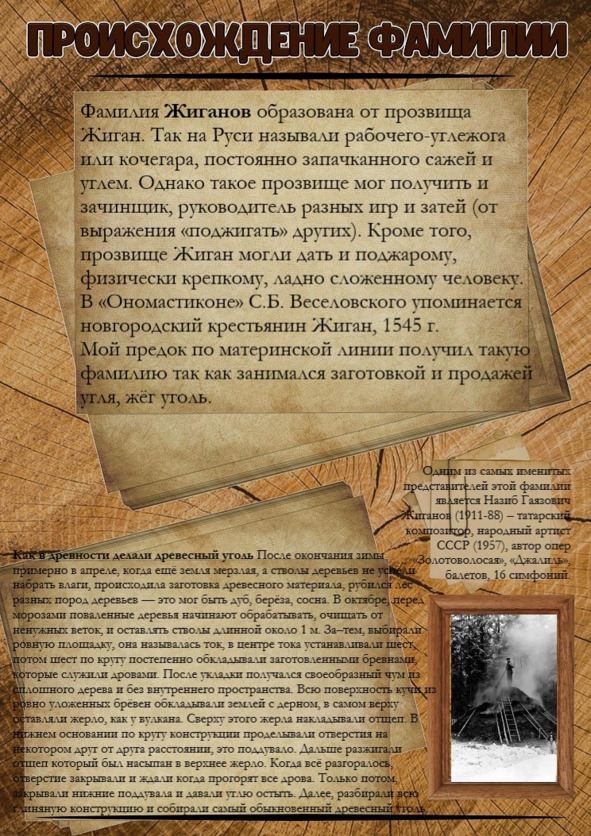 Раньше людей называли по их (или отцовской) деятельности. Предок Кузнецовых был скорее всего кузнецом, а предок Сапожникова – сапожником. Девичья фамилия моей бабушки – Жиганова, образовалась по роду деятельности прапрадеда, который жёг уголь.