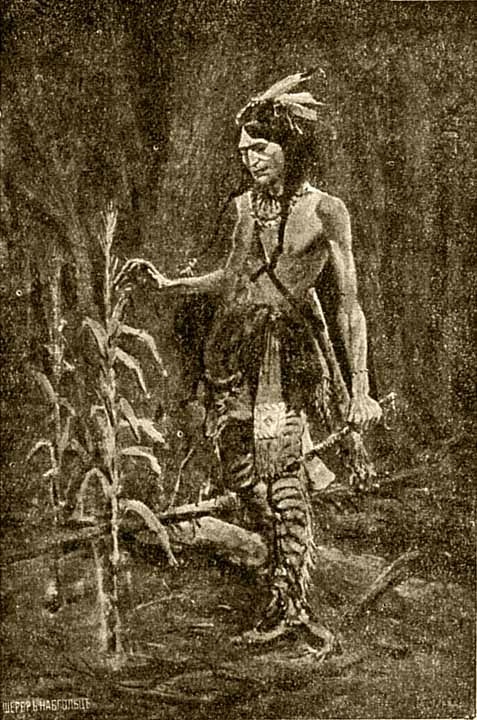 Мать, Голубое Перо, шла на работу, положив своего грудного ребенка в длинный коробок и подвесив его себе на спину. Из коробка торчала голова с двумя огромными круглыми черными глазенками. За матерью шла и дочь Белое Облако работать на кукурузном поле. Туда же собрались женщины и из других вигвамов. Работы было много, и к работе этой все относились с большим вниманием, все знали, что Мондамин – их спасение зимой.