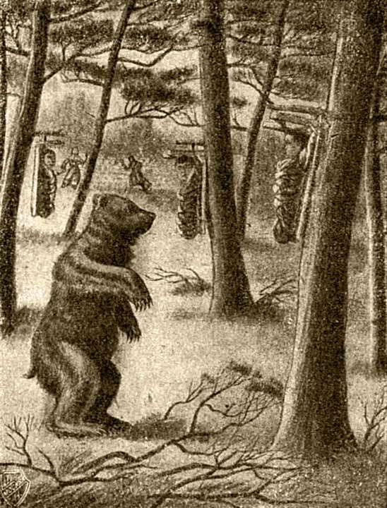 Однако на этот раз случилось так, что дети крикнули, подали сигнал. Женщины работали в кукурузном поле, отходя все дальше и дальше от детей, и не заметили, как к висевшим на деревьях коробкам с детьми незаметно подкрался лесной сосед – медведь. Медведь тихо крался, почуяв привлекательный запах, а может быть в нем просто разгорелось любопытство. Вот он ближе и ближе к ребятам и теперь уж жадно поглядывает на то, что так лакомо пахнет.
