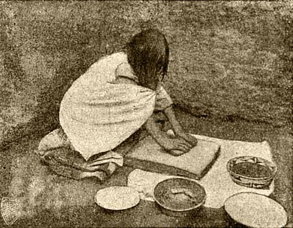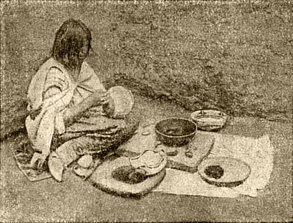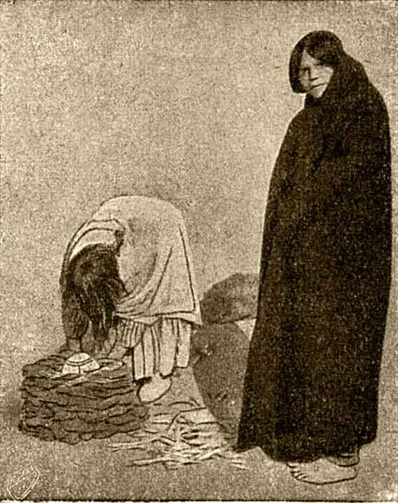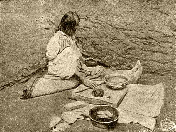 Весь день индейской женщины заполнен. Как ни просто хозяйство, но оно все лежит на ней. Надо и пищу приготовить, и за ребятами смотреть, и посуду делать, и корзинку приготовить, и одеяло выткать.