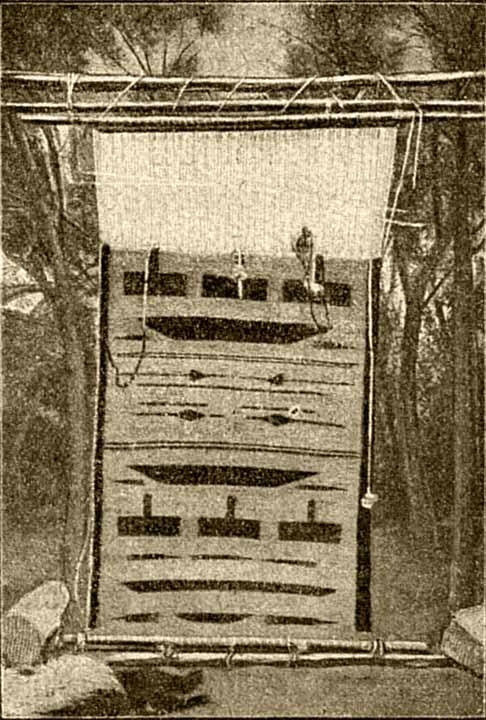 Когда и нитки были окрашены в черную и красную краску, мать принялась ткать одеяло. Она выбрала около вигвама поудобнее деревья, положила на них несколько палок и устроила себе ткацкий станок. День за днем ткала она одеяло. Когда матери бывало некогда, приходилось возиться с ребенком или по хозяйству, Белое Облако бралась за работу, и одеяло подымалось все выше и выше, пока, наконец, не дошло до верхнего конца станка. Теперь оно было готово.