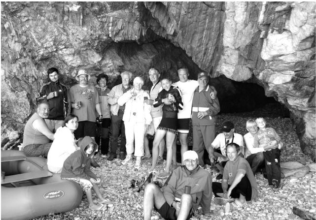 2009 г. Группа красноярцев у пещеры на о. Ольхон /о. Байкал/ с гостями Зигмундом Йеном, Героем Советского Союза, летчиком – космонавтом Германии / в центре справа от Тамары Булевич/ и Зигмунтом Хоренем из Польши / крайний справа в стоящей группе/ – известным в мире проектировщиком парусных судов.