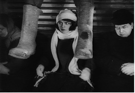 Девушка с коробкой (Анна Стен) – модистка, но здесь она принадлежит не к низшему классу, как Маня-Мери из фильма «Дитя большого города», а к образованной среде – по сравнению с крестьянином Ильей (Иван Коваль-Самборский), приезжающим в Москву из Сибири. То, что она отпрыск отжившего (дворянского, буржазного?) класса и вынуждена теперь зарабатывать на жизнь как шляпница, опускается (или подразумевается?).