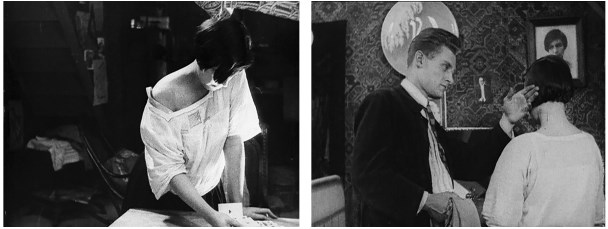 В «Третьей Мещанской» Абрама Роома (1927) три героя – двое мужчин и женщина – находясь в закрытом пространстве, в одной комнате, демонстрируют весь набор интимных техник тела: мытье, зарядку, (пере)одевание, еду, питье, секс, отдых (сон, расслабленное сидение, чтение, слушание радио, игра в шахматы или карты). Скандалы и флирт вписаны в эти элементарные техники движения и телесные отправления. То, что комната находится в подвале, куда нельзя заглянуть с улицы, придает ситуации дополнительную «закрытость»: герои как бы защищены от постороннего взгляда, и камера возвращается к старой роли вуайериста. Но мужские персонажи демонстрируют в публичных пространствах те же жестовые навыки, что и в подвальной комнатушке. Николай (Баталов), работающий на строительстве (реконструкции Большого театра), показан во время еды и курения; Владимир (Фогель) сохраняет свою манеру стоять и ходить и находясь на улице, и управляя полиграфической машиной. Лишь женщина, Людмила (Семенова), которую Владимир соблазняет, приглашая покинуть квартиру и выйти в город (прогулка на аэроплане, поход в кино), резко меняет технику тела (сидеть, ходить и стоять). Она единственный персонаж, для которого жизнь в подвале («запертость» в домашнюю работу, еду, туалет и эротику) окажется невыносимой. В конце фильма мы увидим ее в мчащемся поезде, впервые – с выпрямленной спиной.