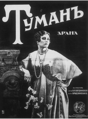 Петр Житков. Плакат к фильму «Туман». 1917. Эта противоречивая – «парижская» – поза соединяет старое представление о грациозности (полу-склоненная голова, косое движение) и неженскую агрессивность (прямой взгляд, выставленный локоть)