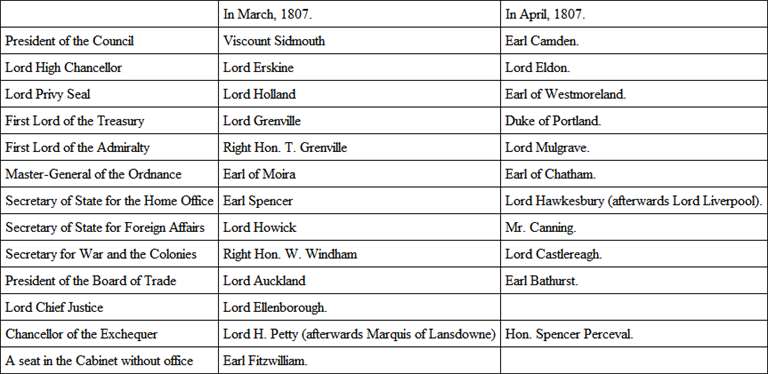 XIILord Grenville and Mr. Fox (the King’s antipathy was this time overborne by necessity) formed the new Ministry, in which Lord Sidmouth (late Mr. Addington), who, Mr. Canning said, “was like the small-pox, since everybody must have him once in their lives,” was also included.