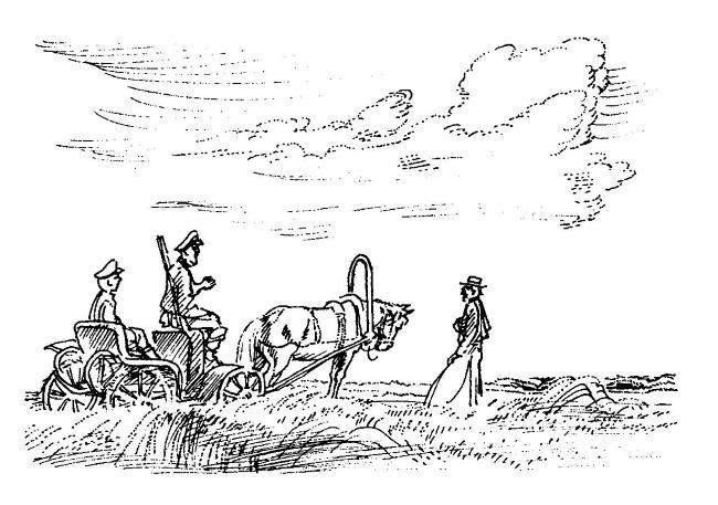 Помещик становится на подножку тарантаса, накренивая его, с трудом усаживается… Но не проходит и минуты, как сзади опять раздается крик: