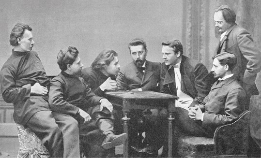 Участники литературного кружка «Среда». Слева направо: Скиталец, Леонид Андреев, Максим Горький, Николай Телешов, Федор Шаляпин, Иван Бунин, Евгений Чириков. 1902 год