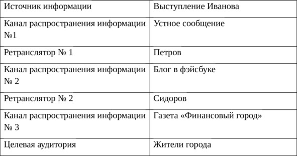 В реальной ситуации, в случае резонансного информационного повода число каналов информации и ретрансляторов может достигать десятков (на муниципальном уровне) и даже сотен (на федеральном уровне).