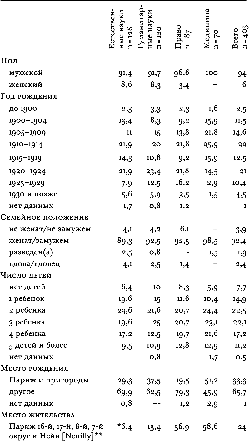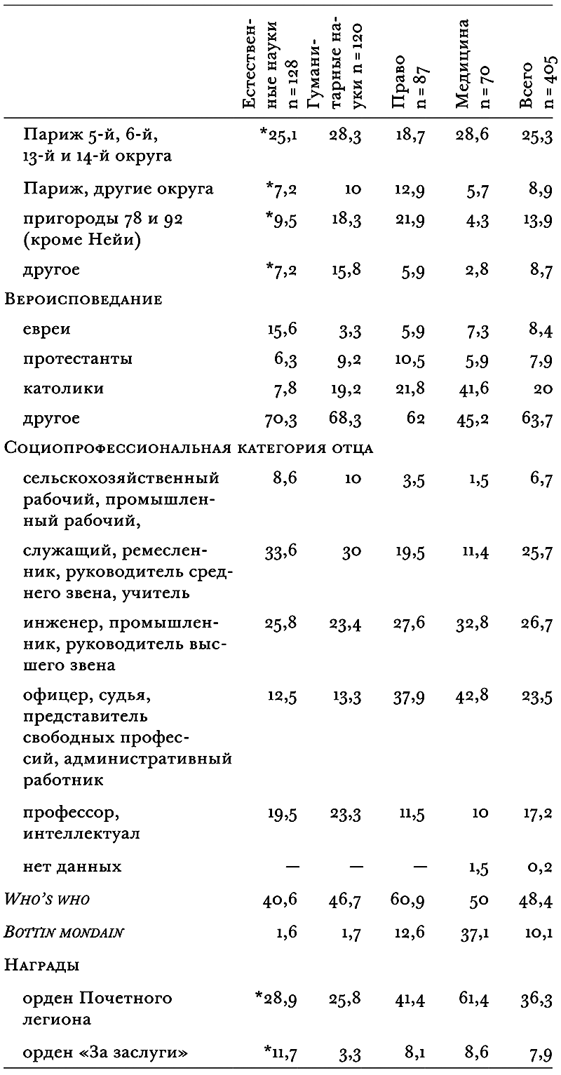 1) основные социальные факторы, определяющие шансы получить доступ к занимаемым позициям, т. е. факторы формирования габитуса и образовательного успеха, экономический и в особенности наследуемые социальный и культурный капиталы: социальное происхождение (профессия отца, факт включения в Bottin mondain[61]), место рождения, вероисповедание родительской семьи[62];