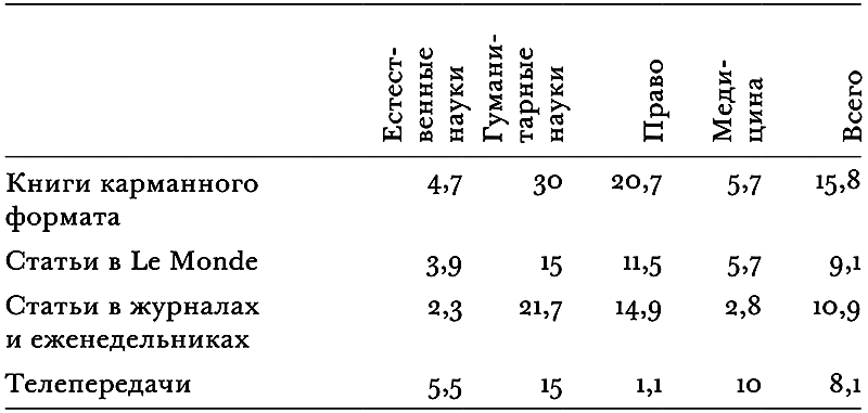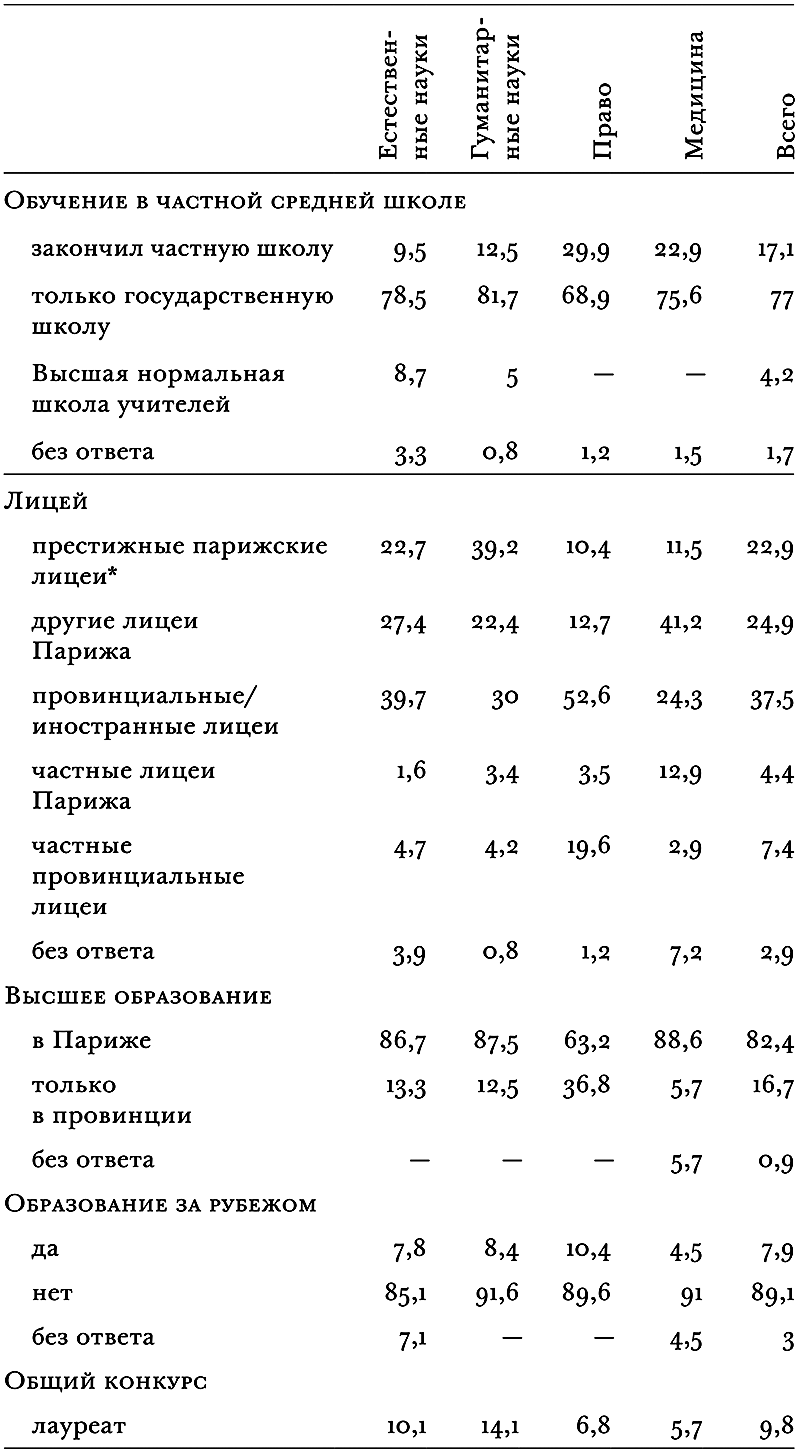 Эта основополагающая оппозиция обнаруживает себя при первом же прочтении статистических таблиц, демонстрирующих распределение различных, более или менее непосредственных показателей экономического и культурного капиталов. Та же иерархия (естественные науки, гуманитарные науки, право, медицина), которая наблюдается при распределении профессоров различных факультетов согласно социальному происхождению, определенному через профессию отца (соответствующая доля профессоров – выходцев из господствующего класса составляет 58, 60, 77 и 85,5 %), обнаруживается и при рассмотрении других показателей социальной позиции, например, обучения в частном образовательном учреждении – за исключением того, что право и медицина меняются местами (9,5; 12,5; 30 и 23 %). Кроме того, можно утверждать, что доля различных фракций (так же иерархизированных согласно экономическому и культурному капиталу), из которых происходят профессора разных факультетов, меняется в том же порядке: доля сыновей профессоров является максимальной в среде профессоров гуманитарных наук (23,3 %) и минимальной в среде профессоров медицины (10 %), тогда как профессора медицины (за исключением медиков-исследователей) и особенно профессора права чаще являются выходцами из семей представителей свободных профессий, управленцев или функционеров общественного или частного секторов[74].