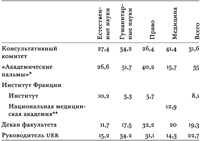 3) капитал университетской власти: принадлежность к Институту[65], Консультативному комитету университетов, обладание позициями вроде декана или руководителя UER, директора института и т. д. (вхождение в состав жюри отборочных конкурсов, Высшей нормальной школы, конкурса на звание и т. д. – эта информация была зафиксирована лишь в исследовании гуманитарных факультетов и не могла быть принята в расчет для всей совокупности факультетов из-за несопоставимости для них этих позиций)[66];