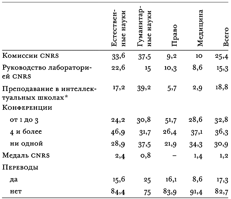Показатели экономического или социального капитала, которым обладают преподаватели различных факультетов, распределены согласно одной и той же структуре, идет ли речь о проживании в шикарном округе: 16, 17, 8, 7-м или «Нейи» (6,4; 13,4; 36,9 и 58,6 % соответственно), включении в Bottin mondain (1,6; 1,7; 12,6; 37,1 %) или же семье с тремя и более детьми (46,3; 48,4; 53,2; 57,6 %). Последнее, несомненно, связано с экономическим капиталом (а также, по крайней мере потенциально, с капиталом социальным), хотя кроме этого и выражает, очевидно, диспозиции, связанные с другими факторами, например с религией, и в частности с явной приверженностью католицизму, показатели которой также распределены согласно той же структуре (7,8; 19,2; 21,8; 41,6 %)[77]. Эти несколько показателей, будучи слишком скудными и косвенными, не могут дать точного представления об экономических различиях между профессорами естественных и гуманитарных наук и профессорами права и особенно медицины, которые, помимо доходов, связанных с должностью профессора и начальника больничного отделения, получают дополнительную прибыль, обеспеченную частной клиентурой[78]. Как бы то ни было, с точки зрения исключительно жалования, без сомнения, наблюдаются сильные расхождения между факультетами, поскольку различия в развитии карьеры приводят к значительным различиям в сумме жалования, полученного за всю жизнь: в этом отношении гуманитарные факультеты, похоже, находятся в самом неблагоприятном положении, поскольку время вступления в должности ассистента и старшего преподавателя здесь является особенно поздним (31 и 37 лет в среднем против 25 и 32 лет в естественных науках и 28 и 34 лет на факультете права в 1978 году) – так же как и доступ к званию доцента и профессора (43 и 50 лет против 34 и 43 лет на факультете права, 35 и 44 лет в естественных науках)[79]. Следовательно, средняя длительность пребывания в должности категории А (доцента или профессора) здесь особенно мала, в 1978 году она составляла 25 лет против 29 в медицине (в которой достигают должности доцента в 39 лет, а профессора – в 49), 33 года в естественных науках и 34 года в праве[80].