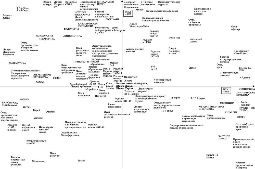 Гомологичное полю власти, университетское поле обладает собственной логикой, и конфликты между фракциями господствующего класса обретают иной смысл, когда они принимают специфическую форму «спора факультетов», говоря словами Канта. Два полюса университетского поля в корне отличаются друг от друга по степени их зависимости от поля власти и тех принуждений и соблазнов, которые оно предлагает или навязывает. Но даже наиболее гетерономные позиции никогда не являются полностью свободными от специфических требований поля, формально ориентированного на производство и воспроизводство знания, – так же как и наиболее автономные позиции никогда полностью не свободны от внешней необходимости социального воспроизводства. Эта автономия подтверждается, главным образом, существованием второй оппозиции, которую обнаруживает анализ соответствий и которая в данном случае основана на чисто внутренних критериях специфического успеха в поле университета, устанавливающих в каждой из областей, определенных первым фактором, резко очерченную и тесно связанную с различиями в социальном происхождении оппозицию между обладателями различных видов специфического капитала и всеми остальными. Так, тем, кто, будучи чаще всего выходцем из низших слоев и провинциалом (кроме того, именно в этой области встречаются женщины), близок к полюсу ненадежной, поскольку зачастую выборной, власти, даруемой участием в комиссиях CNRS, а также чисто университетской власти над воспроизводством корпуса, которую дает принадлежность к Консультативному комитету университетов, противостоят обладатели различных видов специфического капитала, будь то научного престижа (включая золотую медаль CNRS) или же престижа интеллектуального, более или менее монополизированного профессорами гуманитарных факультетов (включая публикации в переводе и в карманных форматах, участие в редколлегиях научных или интеллектуальных журналов, публикации статей в Le Monde и частые появления на телевидении). Эти различия в модели университетского успеха (очевидно, имеющие отношение к возрасту) настолько тесно связаны с социальными различиями, что кажутся переводом в собственно университетскую логику первоначальных различий в инкорпорированном (габитус) или объективированном капитале, связанных с различиями в социальном и географическом происхождении. Они кажутся завершением постепенной трансформации унаследованных преимуществ в преимущества «заслуженные», осуществившейся в течение успешного (как свидетельствует признание на общем конкурсе) обучения в школе и безупречной университетской карьеры – и особенно в связи с каждым из совокупности выборов между отделениями, факультативными дисциплинами и институциями (включая посещение наиболее престижных учреждений среднего образования, лицеев Людовика Великого или Генриха IV), в которых сжимается пространство возможностей.