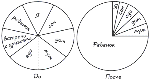 Возьмите лист А4. Нарисуйте с каждой стороны большой круг. Представьте, что круг – это ваше время (24 часа). Сейчас будем рисовать диаграммы. Вспомните, как представляли себе свой день до рождения ребенка: чем вы занимались в своих фантазиях? Что успевали реализовать? Рассмотрите детали: муж, ребенок, спорт, кино, хобби, дом и др. Закрасьте каждый кусочек диаграммы разным цветом. Теперь с другой стороны закрасьте то, на что уходит ваше время сейчас, когда у вас уже реально есть ребенок. Как вам результат?