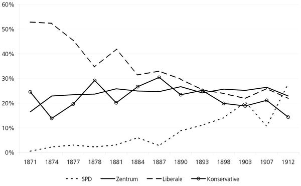 Die großen Tendenzen der Reichstagsmehrheiten illustriert Abbildung A1, die die Anteile der politischen Gruppierungen an den Parlamentssitzen zeigt. Drei große Entwicklungen werden sichtbar: Erstens gab es seit der Reichsgründung einen Niedergang der Liberalen, die wiederum in mehrere, in sich instabile Gruppierungen zerfielen, zweitens setzte seit den späten 1880er Jahren ein signifikanter Aufstieg der Sozialdemokraten ein, drittens stellten Zentrum und Konservative während der gesamten Existenz des Kaiserreichs jeweils ein Fünftel bis ein Viertel der Abgeordneten.