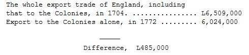 I have in my hand two accounts; one a comparative state of the export trade of England to its Colonies, as it stood in the year 1704, and as it stood in the year 1772; the other a state of the export trade of this country to its Colonies alone, as it stood in 1772, compared with the whole trade of England to all parts of the world (the Colonies included) in the year 1704. They are from good vouchers; the latter period from the accounts on your table, the earlier from an original manuscript of Davenant, who first established the Inspector-General's office, which has been ever since his time so abundant a source of Parliamentary information.