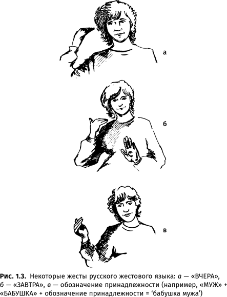 Жестовые языки глухих обладают всеми свойствами, присущими звуковым языкам, кроме канала передачи информации28. Вопреки распространенному заблуждению, жесты этих языков передают не отдельные буквы (хотя пальцевая азбука – дактилология – тоже имеется, прежде всего для передачи имен собственных), а целые слова (или морфемы). Каждый жест-слово состоит из незначимых элементов – хирем, а из слов, как и в звуковом языке, составляются словосочетания и предложения.