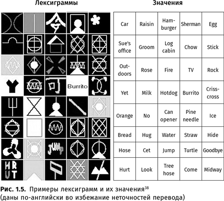Шимпанзе Лана, Шерман и Остин, бонобо Канзи и Панбаниша (под руководством Дуэйна Рамбо и Сью Сэвидж-Рамбо33) овладевали разработанным в американском Национальном приматологическом центре Йеркса языком йеркиш, где словами служат лексиграммы – специальные значки, изображенные на клавиатуре компьютера (например, смысл ‘апельсин’ передается изображением белого трезубца на черном фоне, смысл ‘обнять’ – розовым контуром квадрата на желтом фоне, смысл ‘хотдог’ – голубым иероглифом