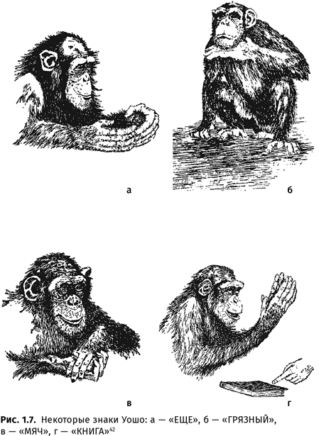 Так, шимпанзе Уошо (под руководством Аллена и Беатрис Гарднер), Элли и Люси (под руководством Роджера Футса), гориллы Коко и Майкл (под руководством Фрэнсин Паттерсон31) и орангутан Чантек (под руководством Лин Майлс32) изучали амслен (американский жестовый язык глухих, от англ. AmSLan – American Sign Language) в несколько модифицированной версии: грамматика этого языка-посредника не соответствует грамматике настоящего амслена, она сильно сокращена и до некоторой степени приближена к грамматике устного английского.