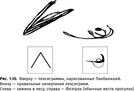 А недавно выяснилось, что обезьяны в принципе способны даже овладеть письмом: однажды Панбаниша (одна из сестер Канзи), в одиночестве тоскуя у окна и желая отправиться на прогулку, в конце концов взяла в руки мел и нарисовала на полу соответствующие лексиграммы (наиболее узнаваем уголок – символ, обозначающий хижину в лесу)51.