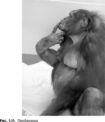 Возможность передачи языковых навыков потомству также оказалась не уникальной для человека50. Шимпанзе Уошо обучила своего приемного сына Лулиса знакам «амслена» (люди не показывали знаков не только ему лично, но и в его присутствии, но он перенял 55 знаков от Уошо и других обезьян), и в результате они смогли общаться на этом языке-посреднике между собой.