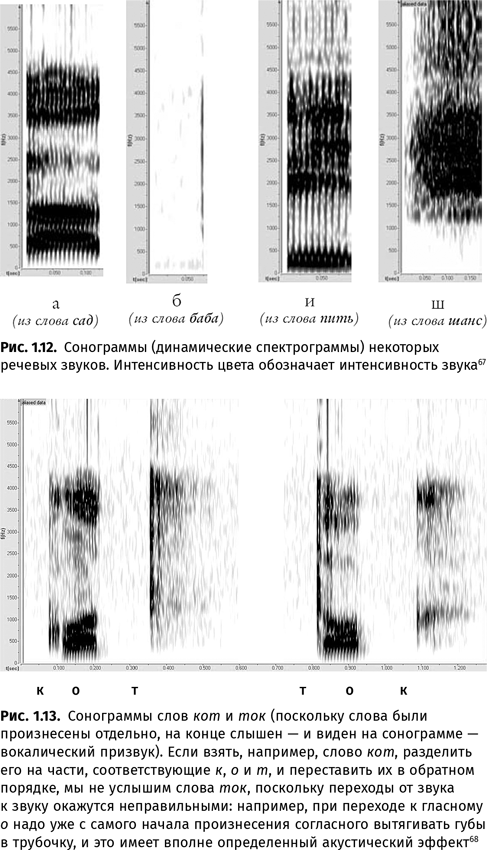 Непросто устроены и сами звуки. Наш речевой тракт – природный резонатор. Изменяя его форму при помощи движений языка, губ, нижней челюсти, нёбной занавески, надгортанника, мы ослабляем одни частоты и усиливаем другие. У гласных такие области усиления частот получили название «форманты». Каждый гласный характеризуется собственным «узором» формант. Согласные тоже имеют свои частотные максимумы и минимумы, но распознаются в значительной степени по тому влиянию, которое они оказывают на форманты соседствующих с ними гласных. Например, после заднеязычного согласного (г или к) у последующего гласного сближаются начальные точки контуров второй и третьей формант. Если звуки в слоге поменять местами, человек услышит не слог, произнесенный наоборот, а бессмысленную абракадабру, поскольку привычные ему правила перехода от звука к звуку не будут соблюдены.