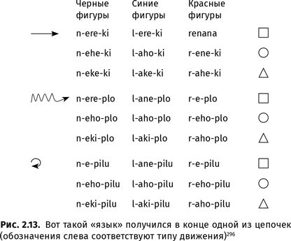 Возможность не только найти структуру в хаосе, но даже создать ее из ничего была показана в эксперименте Саймона Кирби и его коллег. Они говорили испытуемым, что им необходимо выучить язык инопланетян (а главное – ни в коем случае не обидеть их, так что отказываться от ответов на вопросы нельзя!). Перед испытуемыми на экране компьютера появлялись круги, квадраты и треугольники красного, синего и черного цвета, которые могли двигаться по горизонтали, прыгать или крутиться, и слова, которые инопланетяне якобы употребляют для называния этого. За тренировочным сеансом следовал тестовый, когда «инопланетные» слова, соответствующие изображению на экране, надо было вписывать самому. Подвох заключался в том, что в тестовом сеансе испытуемому предъявлялось вдвое больше разных изображений, чем было во время тренировки, но сами испытуемые этого не замечали (трудно уловить, что в прошлый раз крутился, например, синий квадрат, а синий круг, наоборот, двигался по прямой). Первому испытуемому доставались названия, случайным образом синтезированные машиной (из ограниченного числа возможных слогов), второму – названия, которые этим изображениям дал первый испытуемый во время теста (вернее, только каждое второе из них – поскольку в тренировочном сеансе испытуемый видел лишь половину всех возможных изображений), третьему – результат теста второго и так до последнего, десятого, члена цепочки. Для того чтобы испытуемые не начали в итоге называть все изображения одним-двумя словами, была введена такая поправка: если кто-то во время теста повторял названия, то следующему испытуемому в тренировочном сеансе доставалось лишь одно из соответствующих изображений. В итоге в четырех цепочках независимо возникли несколько разные, но вполне структурированные «языки»: отдельная морфема – для обозначения цвета, отдельная – для формы и отдельная – для типа движения. Впрочем, без исключений тоже не обошлось – как и в настоящем языке297.