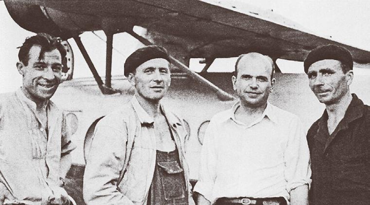 Илл. 66. Экипаж С-43 «СССР Н-207» в 1939 г. Слева направо: пилот С. И. Атюшев, бортмеханик С. Писарев, командир корабля А. Д. Алексеев, бортмеханик Ф. И. Краснов. Фото из открытых источников