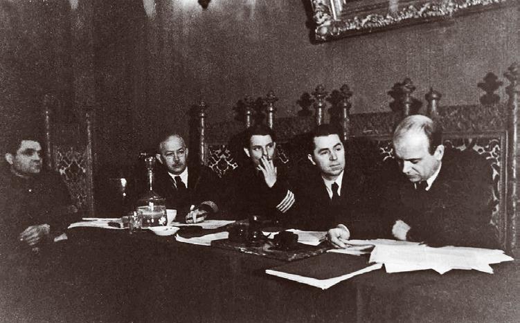 Илл. 67. Заседание президиума конференции Управления полярной авиации. Слева направо: известный ученый, профессор, доктор географических наук Н. Н. Зубов (второй слева), начальник полярной авиации М. И. Шевелёв, начальник Главсевморпути И. П. Мазурук и А. Д. Алексеев. 1941 г.