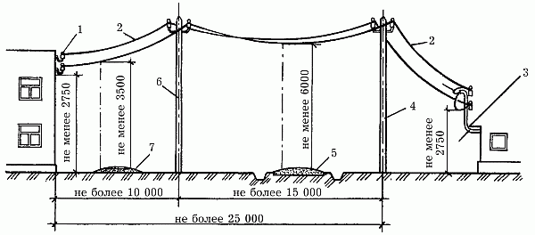 Провода ответвления должны быть расположены на высоте не менее 6 м от земли над проезжей частью и не менее 3,5 м над тротуарами и внутри дворов.