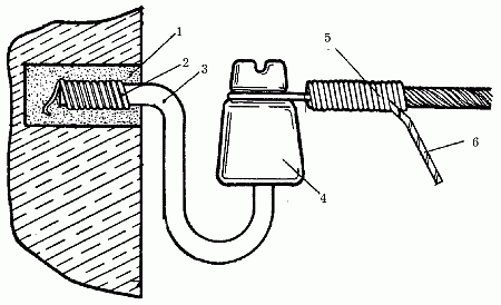 Рис. 24. Правильная установка крюков и изоляторов: 1 – цементный раствор; 2 – проволока; 3 – крюк; 4 – изолятор; 5 – вязка; 6 – провод для присоединения ввода