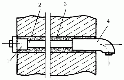Рис. 27. Конструкция прохода через стену: 1 – втулка; 2 – трубка; 3 – раствор цементно-алебастровый; 4 – воронка