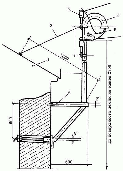 Рис. 28. Ввод трубостойкой через стену: 1 – крыша; 2 – оттяжка; 3 – изоляторы; 4 – трубостойка; 5 – болт; 6 – кронштейн