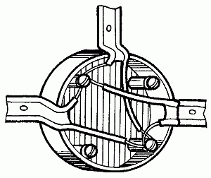 Провода ответвления закрепляются на установленных на крюках изоляторах. В рубленые стены крюки изоляторов ввинчивают в подготовленные отверстия диаметром и глубиной чуть меньше соответствующих размеров крюка. В кирпичных или бетонных стенах каждый крюк устанавливается в пробитое отверстие глубиной 10 см и диаметром в 2,5 раза больше диаметра самого крюка и закрепляется цементным раствором. Раствор должен затвердеть прежде, чем изолятор окажется под действием веса проводов. На все остальные типы стен (каркасно-засыпные, дощатые и т. п.) крюки устанавливают на деревянном брусе толщиной не менее 6–7 см, а уже сам брус привинчивают к стене (рис. 24).
