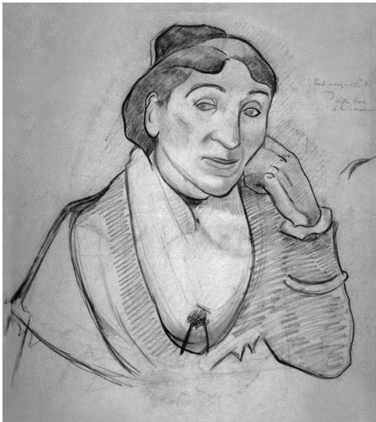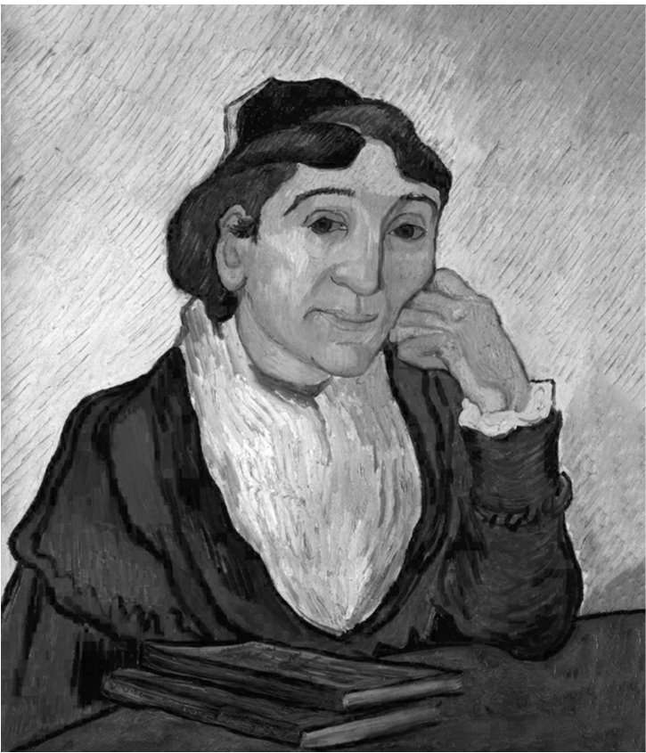 Мари-Жюльен Жину (1848–1911) – супруга владельца Café de la Gare. В нояб ре 1888 г. по настоянию Ван Гога и Гогена мадам Жину согласилась на один сеанс позирования. Гоген исполнил крупноформатный рисунок углём, который был использован в написанной тогда же картине «Кафе в Арле». Картина с 1908 г. находилась в московской коллекции И.А. Морозова. Тогда же Ван Гог исполнил два портрета мадам Жину (музей Орсе, Париж; музей Метрополитен, Нью-Йорк). Известны ещё четыре версии портрета, которые художник создал в феврале 1890 г. В работе над ними он опирался на упомянутый выше рисунок Гогена.