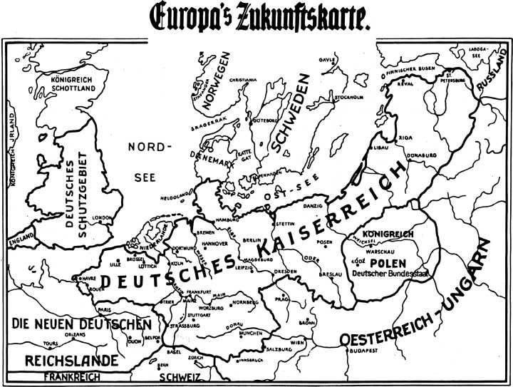 Так в Германии пропаганда представляла мир после Великой войны. Обратите внимание, что «королевство Польша» как союзное с Германией государство есть, а вот Британия сводится к Корнуольскому полуострову, Франция отодвигается южнее Луары, а Санкт-Петербург становится пограничным городом, но отторгается от России и находится на территории Рейха.