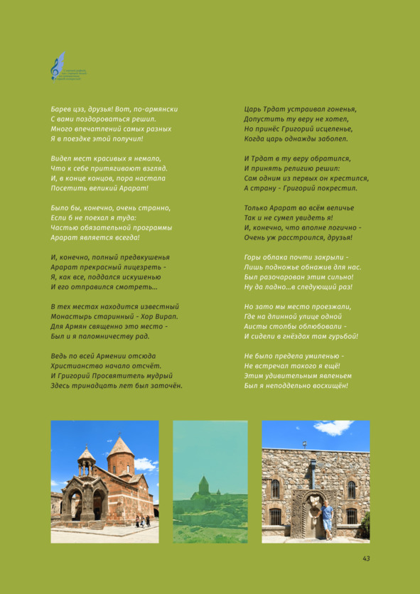 Некоторые люди спрашивают меня: «Как удается столько путешествовать?» В ответе на этот вопрос – моя биография: я всегда в движении. Три высших образования, научная деятельность, большой опыт на руководящих должностях, разные события в моей жизни закалили характер, и я знаю, что на человека большое влияние оказывает мотивация. Про себя могу сказать: лучший мотиватор – это я сам. Поэтому сам составляю свои маршруты. Если вдруг вы решите путешествовать по моему маршруту и добавите в навигатор достопримечательность, о которой я когда-либо писал, на картах найдете отзыв с моими стихами и фотографиями.