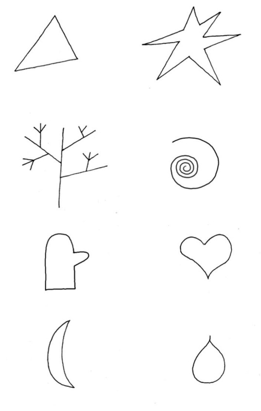 Wave, spiral, paper clip, fir tree, snowflake, arrow, hook.