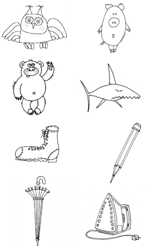 Umbrella, globe, boot, hammer, saw, flower, apple.