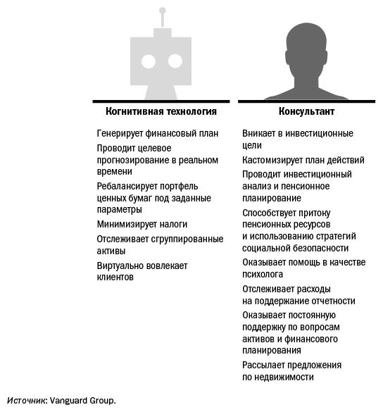 Например, инвестиционная компания Vanguard запустила новое предложение «Персональные консультативные услуги» (PAS), которое сочетает автоматизированные рекомендации по инвестициям и работу живых консультантов. В этой системе когнитивные технологии применяются для выполнения многих традиционных задач инвестиционного консультирования, включая создание индивидуального портфеля, изменение его баланса с течением времени, сбор налоговых выплат и выбор инвестиций с благоприятным налоговым статусом.