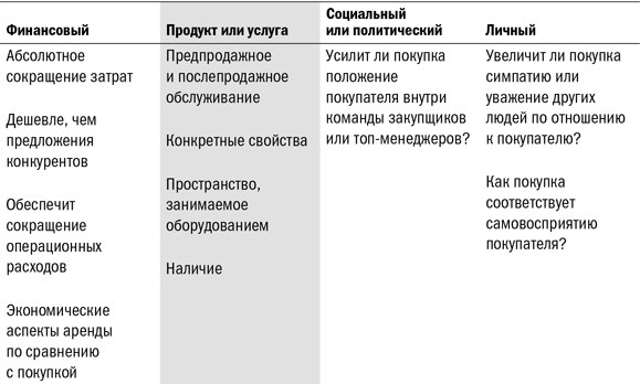 Во-вторых, покупатели распределяют потенциальные преимущества по различным категориям. К наиболее распространенным относятся финансовая, продукт-услуга, социально-политическая и личная. Для некоторых покупателей основными становятся финансовые преимущества, другие выше всего ставят социально-политические, а именно то, как другие сотрудники компании оценят покупку. Конечно, категории могут быть связаны между собой – например, когда покупка продукта по самой низкой цене (финансовое преимущество) ведет к хорошей оценке деятельности и повышению (социально-политическое преимущество).